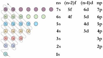 ②根据构造原理,可以将各能级按能量的差异分成能级组如图⑵所示,由下而上表示七个能级组,其能量依次升高;在同一能级组内,从左到右能量依次升高。基态原子核外电子的排布按能量由低到高的顺序依次排布。