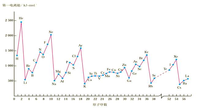 气态电中性基态原子失去1个电子,转化为气态基态正离子所需要的能量叫做第一电离能。常用符号I1表示,单位为kJ/mol。