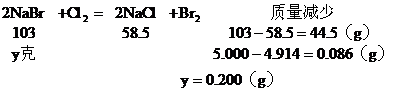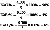 6. 将5.000gNaCl、NaBr、CaCl2的混合物溶于水,通入氯气充分反应,然后把溶液蒸干并灼烧,得残留物4.914g。灼烧后的残留物再溶于水,并加足量的Na2CO3溶液,所得沉淀经干燥后质量为0.270g。求混合物中各化合物的质量百分组成。