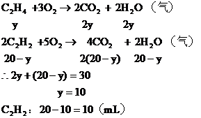 分析:气态烃的碳原子数都小于4。20mL混合烃完全燃烧生成40mL CO2和30mL水蒸气,可知1mol混合烃平均含2mol C原子和3mol H原子,从而推知,该混合烃只能是C2H6和C2H2或C2H4和C2H2的混合物。