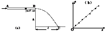 (6分)利用图(a)实验可粗略测量人吹气产生的压强。两端开口的细玻璃管水平放置,管内塞有潮湿小棉球,实验者从玻璃管的一端A吹气,棉球从另一端B飞出,测得玻璃管内部截面积S,距地面高度h,棉球质量m,开始时的静止位置与管口B的距离x,落地点C与管口B的水平距离l。然后多次改变x,测出对应的l,画出l2-x关系图线,如图(b)所示,并由此得出相应的斜率k。