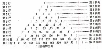 杨辉三角是杨辉的一大重要研究成果,它的许多性质与组合数的性质有关,杨辉三角中蕴藏了许多优美的规律。下图是一个11阶杨辉三角:
