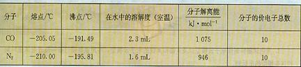 [讲]表2-3数据表明,CO分子和N2分子在许多性质上十分相似,这些相似性,可以归结为它们具有相等的价电子总数,导致它们具有相似的化学结构,由此形成了等电子原理的概念一一原子总数相同、价电子总数相同的分子具有相似的化学键特征,它们的许多性质是相近的。