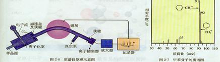 现代化学常利用质谱仪测定分子的结构。它的基本原理是在质谱仪中使分子失去电子变成带正电荷的分子离子和碎片离子等粒子。由于生成的分子离子、碎片离子具有不同的相对质量,它们在高压电场加速后,通过狭缝进入磁场分析器得到分离,在记录仪上呈现一系列峰,化学家对这些峰进行系统分析,便可得知样品分子的结构。例如,图2-7的纵坐标是相对丰度(与粒子的浓度成正比),横坐标是粒子的质量与电荷之比(m/e),简称质荷比。化学家通过分析得知,m/e=92的峰是甲苯分子的正离子(C6H5CH3+),m/e=91的峰是丢失一个氢原子的的C6H5CH2+ ,m/e=65的峰是分子碎片……因此,化学家便可推测被测物是甲苯。