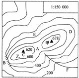 A、山顶   B、山谷  C、陡崖   D、鞍部