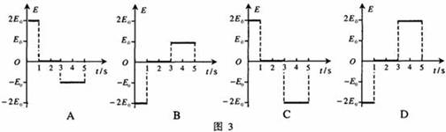 1.在竖直向上的匀强磁场中,水平放置一个不变形的单匝金属圆线圈,规定线圈中感应电流的正方向如图1所示,当磁场的磁感应强度B随时间t如图2变化时,图3中正确表示线圈中感应电动势E变化的是