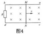 2.如图4所示,两根相距为l的平行直导轨ab、cd、b、d间连有一固定电阻R,导轨电阻可忽略不计。MN为放在ab和cd上的一导体杆,与ab垂直,其电阻也为R。整个装置处于匀强磁场中,磁感应强度的大小为B,磁场方向垂直于导轨所在平面(指向图中纸面内)。现对MN施力使它沿导轨方向以速度v(如图)做匀速运动。令U表示MN两端电压的大小,