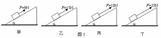 12、一个质量为3kg的物体,被放置在倾角为a=37°的动摩擦因数为0.2的固定斜面上,在如图5所示的甲、乙、丙三种情况下可能处于平衡状态的是 (令最大静摩擦力等于滑动摩擦力,sin37°=0.6,g=10m/s2)