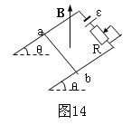 (12分)如图14所示,质量为m,电阻不计的金属杆ab放在宽度为L,倾角为θ的导轨上,导轨电阻也不计,其上端接电动势为E,内阻为零的直流电源和可变电阻R,磁感应强度为B的匀强磁场竖直向上穿过导轨上面,金属杆ab与导轨间的最大静摩擦力为f,要使ab棒静止在导轨上不动,求可变电阻R的取值范围。
