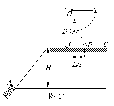 (14分)如图14所示,在同一竖直平面上,质量为2m的小球A静止在光滑斜面的底部,斜面高度为H=2L。小球受到弹簧的弹性力作用后,沿斜面向上运动。离开斜面后,达到最高点时与静止悬挂在此处的小球B发生弹性碰撞,碰撞后球B刚好能摆到与悬点O同一高度,球A沿水平方向抛射落在水平面C上的P点,O点的投影O'与P的距离为L/2。已知球B质量为m,悬绳长L,视两球为质点,重力加速度为g,不计空气阻力,求: