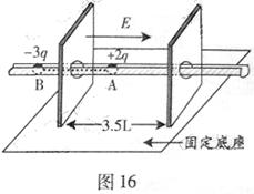 如图16所示,沿水平方向放置一条平直光滑槽,它垂直穿过开有小孔的两平行薄板,板相距3.5L。槽内有两个质量均为m的小球A和B,球A带电量为+2q,球B带电量为-3q,两球由长为2L的轻杆相连,组成一带电系统。最初A和B分别静止于左板的两侧,离板的距离均为L。若视小球为质点,不计轻杆的质量,在两板间加上与槽平行向右的匀强电场E后(设槽和轻杆由特殊绝缘材料制成,不影响电场的分布),求: