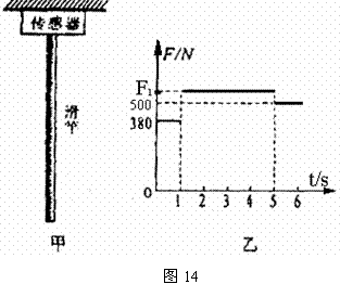 17.(16分)如图14甲所示为学校操场上一质量不计的竖直滑竿,滑竿上端固定,下端悬空。为了研究学生沿竿的下滑情况,在竿顶部装有一拉力传感器,可显示竿顶端所受拉力的大小。现有一学生(可视为质点)从上端由静止开始滑下,5s末滑到竿底时速度恰好为零。以学生开始下滑时刻为计时起点,传感器显示的拉力随时间变化情况如图乙所示,g取10m/s2。求: