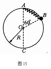 18.(15分)如图15,一个质量为m=0.2kg的小球系于轻质弹簧的一端,且套在光滑竖直的圆环上,弹簧固定于环的最高点A,环的半径R=0.5m,弹簧原长L0=0.5m,劲度系数为k=4.8N/m,若小球从图示位置B点由静止开始滑到最低点C时,弹簧的弹性势能E弹=0.60J。求: