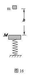 19(14分)如图16所示,质量为M=400g的铁板固定在一根轻弹簧上方,铁板的上表面保持水平.弹簧的下端固定在水平面上,系统处于静止状态.在铁板中心的正上方有一个质量为m=100g的木块,从离铁板上表面高h=80cm处自由下落.木块撞到铁板上以后不再离开,两者一起开始做往复运动.木块撞到铁板上以后,共同下降L1=2.0cm的时刻,它们的共同速度第一次达到最大值.又继续下降了L2=8.0cm后,它们的共同速度第一次减小为零.空气阻力忽略不计,弹簧的形变始终在弹性限度内,重力加速度取g=10m/s2.求:
