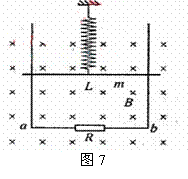 两根足够长的光滑导轨竖直放置,间距为L,底端接阻值为R的电阻。将质量为m的金属棒悬挂在一个固定的轻弹簧下端,金属棒和导轨接触良好.导轨所在平面与磁感应强度为B的匀强磁场垂直,如图7所示。除电阻R外其余电阻不计。现将金属棒从弹簧原长位置由静止释放,则