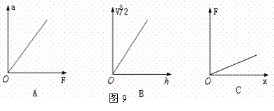 (12分)(1)在①研究加速度与外力(质量一定)的关系;②验证机械能守恒定律;③探究弹力大小与弹簧伸长量之间的关系三个实验中;某同学正确地作出了三个实验的图线,如图9中A、B、C所示。根据坐标轴代表的物理量判断;A是实验_________(只需填序号)的图线,其斜率表示_________;B是实验_________的图线,其斜率表示_________。