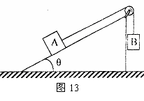 (10分)如图13所示,跨过定滑轮的轻绳两端分别系着物体A和B,物体A放在倾角为θ的斜面上.已知物体A的质量为m, 物体A与斜面间的动摩擦因数为μ(μ<tgθ), 滑轮的摩擦不计,要使物体A静止在斜面上,求物体B的质量的取值范围.