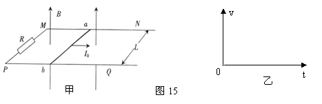 17、(17分)如图15甲所示,足够长的金属导轨MN和PQ与一阻值为R的电阻相连,平行地放在水平桌面上,质量为m的金属杆可以无摩擦地沿导轨运动.导轨与ab杆的电阻不计,导轨宽度为L,磁感应强度为B的匀强磁场垂直穿过整个导轨平面.现给金属杆ab一个初速度v0,使ab杆向右滑行.回答下列问题: