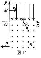 (17分)在平面直角坐标系xOy中,第Ⅰ象限存在沿y轴负方向的匀强电场,第Ⅳ象限存在垂直于坐标平面向外的匀强磁场,磁感应强度为B。一质量为m、电荷量为q的带正电的粒子从y轴正半轴上的M点以速度v0垂直于y轴射入电场,经x轴上的N点与x轴正方向成θ=60°角射入磁场,最后从y轴负半轴上的P点垂直于y轴射出磁场,如图16所示。不计粒子重力,求