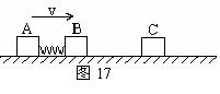 (16分)用轻质弹簧相连的质量均为2kg的A、B两物块都以v=6m/s的速度在光滑的水平地面上运动,弹簧处于原长,质量为4kg的物块C静止在前方,如图17所示,B与C碰撞后二者粘在一起运动,求: