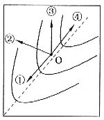 5. 右图为一段等高线地形图,实线为等高线(单位:米),虚线泥石流路线,若此时游客正好位于O点,则其正确的逃生路线是