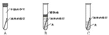 一周后发现,A、B试管中的铁钉均没有明显的变化,而C试管中的铁钉表面有明显的铁锈出现,且铁钉与水面接触的部位锈蚀情况最严重。