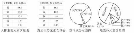 ⑴观察下列图表,氧元素在人体、海水、空气地壳4种体系中,质量分数由高到低的顺序为___________________________________________________(填4种体系的名称)。