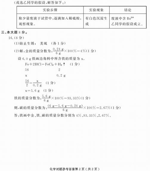 ⑵已知镀金铁画中只含有金、铁、碳三种元素,某同学为探究镀金铁画中三种元素的含量,进行了如下实验:取镀金铁画的边角料6g,磨成粉末,放入足量的稀盐酸中,收集到0.2g氢气,溶液过滤后,将残渣洗净、烘干,在空气中充分灼烧,剩余固体的质量为0.24g。求:铁画中金、铁、碳的质量分数。