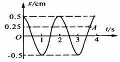 解析:由图可知A在t轴上方,位移x=0.25cm,所以弹力F=-kx=-5N,即弹力大小为5N,方向指向x轴负方向,选项A不正确;由图可知过A点作图线的切线,该切线与x轴的正方向的夹角小于90°,切线斜率为正值,即振子的速度方向指向x轴的正方向,选项B正确. 由图可看出,t=0、t=4s时刻振子的位移都是最大,且都在t轴的上方,在0-4s内完成两次全振动,选项C错误.由于t=0时刻和t=4s时刻振子都在最大位移处,所以在0-4s内振子的位移为零,又由于振幅为0.5cm,在0-4s内振子完成了2次全振动,所以在这段时间内振子通过的路程为2×4×0.50cm=4cm,故选项D错误.