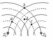 [例1] 如图所示,S1、S2是两个相干波源,它们振动同步且振幅相同。实线和虚线分别表示在某一时刻它们所发出的波的波峰和波谷。关于图中所标的a、b、c、d四点,下列说法中正确的有