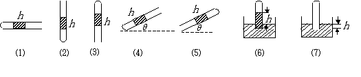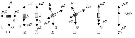 本题的所有试管的加速度都为零.所以在⑴中:G=N,p0S=PS;在⑵图中:p0S+G=pS,p0S+ρghS=pS,取cmHg(厘米汞柱)为压强单位则有:p= p0+h;同理,图⑶中试管内气体的压强为:p= p0-h;采用正交分解法解得:图⑷中:p= p0+hsinθ;图⑸中:p=p0-hsinθ;图⑹中取高出槽的汞柱为研究对象,可得到:p= p0-h;图⑺中取与管内气体接触的水银面(无质量)为研究对象:p0S+ρghS=pS,p= p0+h