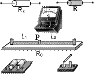 例8. 电桥法测电阻。利用给出的电路图和器材(G为灵敏电流表,R0为阻值均匀的电阻丝,R为已知阻值的定值电阻,Rx为被测电阻)。要求利用这些器材测未知电阻Rx。(1)实验中还需要什么测量仪器?