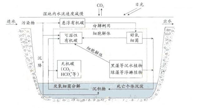(1)当污染物随水流进入该湿地时,湿地水体中碳元素的迁移和转化途径如下图。请用箭头和文字补充虚线框中的碳转化途径。