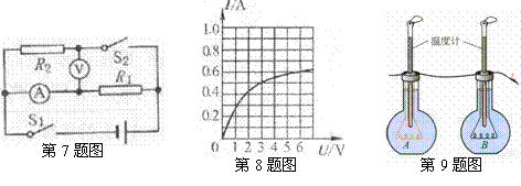 7. 如图所示电路,电源电压不变,R1、R2的阻值分别为10Ω和20Ω。闭合S1、断开S2时,电流表的示数为0.3A;当同时闭合S1、S2时,电压表的示数为_______V,电路消耗的总功率为_______W。