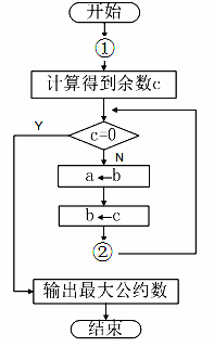 (1)根据以上分析,画出“辗转相除法求最大公约数”算法流程图如下。其中编号①处应画内容为 ▲ ,编号②处应画内容为 ▲ 。(2分)