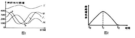 (7分)下图1表示某生态系统中构成一条食物链的甲、乙、丙、丁4个种群的数量变化,图2表示某植食性昆虫迁入该生态系统后的种群增长率变化曲线。