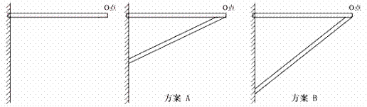 如图所示,这是一根固定在墙上的实心铁棒,O点可以挂置花盆等物。为了增加其最大承重,小明同学提出了A、B两种加固方案。其中,方案A、B中所有铁棒直径均为6mm。请分析这两种方案,回答下列问题:
