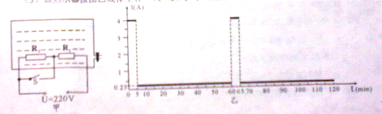 36.(10分)如图甲所示是家用电热水器的简易示意图,通过开关S的断开或闭合可使热水器处于保温或加热状态。已知热水器水箱装水60kg,R1、R2均为发热电阻丝,R1=55Ω,R2=825Ω,电源电压220V恒定。图乙是电热水器工作时电路中电流随时间变化的规律。问: