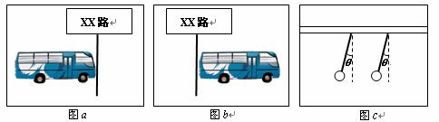 如图a、b所示,是一辆质量为6×103kg的公共汽车在t=0和t=4s末两个时刻的两张照片。当t=0时,汽车刚启动(汽车的运动可看成匀加速直线运动)。图c是车内横杆上悬挂的拉手环经放大后的图像(其中细绳与竖直方向的夹角可以测量)。根据题中提供的信息,可以估算出的物理量有( )