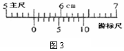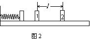 利用如图2所示装置测量滑块与长1m左右的木板间动摩擦因数及被压缩弹簧的弹性势能,图中木板固定在水平面上,木板的左壁固定有一个处于锁定状态的压缩轻弹簧(弹簧长度与木板相比可忽略),弹簧右端与滑块接触,1和2是固定在木板上适当位置的两个光电门,与之连接的两个光电计时器没有画出。现使弹簧解除锁定,滑块获得一定的初速度后,水平向右运动,光电门1、2各自连接的计时器显示的挡光时间分别为2.0×10-2s和5.0×10-2s,用游标卡尺测量小滑块的宽度d,卡尺示数如图3所示.