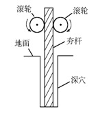 (8分)如图是建筑工地上常用的一种“深穴打夯机”示意图,电动机带动两个滚轮匀速转动将夯杆从深坑提上来,当夯杆底端刚到达坑口时,两个滚轮彼此分开,将夯杆释放,夯杆在自身重力作用下,落回深坑,夯实坑底。然后两个滚轮再次压紧,夯杆被提上来,如此周而复始(夯杆被滚轮提升过程中,经历匀加速和匀速运动过程)。已知两个滚轮边缘的线速度恒为v=4m/s,滚轮对夯杆的正压力FN=2×104N,滚轮与夯杆间的动摩擦因数μ= 0.3,夯杆质量m = 1×103kg,坑深h = 6.4m,假定在打夯的过程中坑的深度变化不大,取g =10m/s2。求: