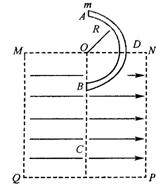18.(10分)如图所示,矩形区域MNPQ内有水平向右的匀强电场,虚线框外为真空区域;半径为R、内壁光滑、内径很小的绝缘半圆管ADB固定在竖直平面内,直径AB垂直于水平虚线MN,圆心O恰在MN的中点,半圆管的一半处于电场中.一质量为m,可视为质点的带正电,电荷量为q的小球从半圆管的A点由静止开始滑入管内,小球从B点穿出后,能够通过B点正下方的C点.重力加速度为g,小球在C点处的加速度大小为