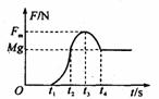 9、利用传感器和计算机可以研究快速变化的大小,实验时让某消防队员从一平台上跌落,自由下落2m后双脚触地,接着他用双腿弯曲的方法缓冲,使自身重心又下降了0. 5 m,最后停止,用这种方法获得消防队员受到地面冲击力随时间变化图线如图所示,根据图线所提供的信息以下判断错误的是( )![]()