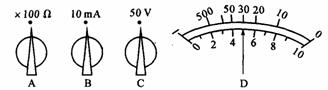 (2)(6分)如图所示,A、B、C是多用表在进行不同测量时转换开关分别指示的位置,D是多用表表盘指针在测量时的偏转位置。