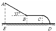 16、(12分)如图所示为儿童娱乐的滑滑梯示意图,其中AB为斜面滑槽,与水平方向夹角为37°,斜面AB与水平滑槽BC有一小圆弧连接,水平滑槽BC与半径为0.2 m的1/4圆弧CD相切,ED为地面。已知通常儿童在滑槽上滑动时的动摩擦因数大约为0.5,A点离地面的竖直高度AE为2 m,不计空气阻力,求: