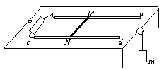 的平行光滑金属导轨ab与cd,阻值为R的电阻与导轨的a、c端相连。金属滑杆MN垂直于导轨并可在导轨上滑动。整个装置放于匀强磁场中,磁场的方向竖直向上,磁感应强度的大小为B。滑杆与导轨电阻不计,滑杆的中点系一不可伸长的轻绳,绳绕过固定在桌边的光滑轻滑轮后,与一质量为m的物块相连,拉滑杆的绳处于水平拉直状态。现若从静止开始释放物块,用I表示回路中的感应电流,g表示重力加速度,则在物块下落过程中物块的速度可能 ( )