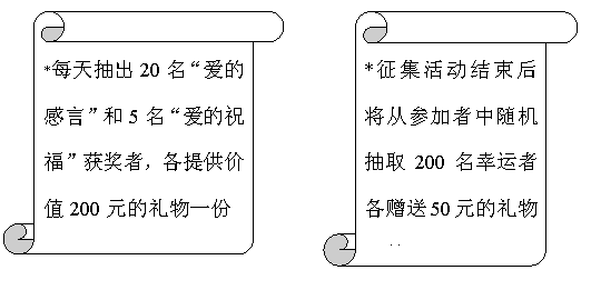 1.(2008年四川省宜宾市)5月11日是“母亲节”,《×××时报》在2008年5月8日刊登了一则有奖征集活动启事:2008年5月8日起至2008年5月11日止,你可以通过拨打爱心热线电话、发送爱心短信和登陆社区文明网站三种方式参加“爱的感言”和“爱的祝福”活动,活动规则如下: