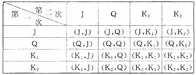 从表上可以看出,一次游戏可能出现的结果共有16种,而且每种结果出现的可能性相等,其中两次取出的牌中都没有K的有(J,J),(J,Q),(Q,J),(Q,Q)等4种结果。