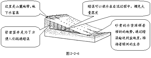 绿洲是新疆农业生产基地,坎儿井是特有的灌溉工程,主要农作物有小麦、玉米、高粱等。 基于特有的光热条件,棉花、短菜和多种瓜果成为新疆绿洲的特色农产品。它们以产量丰富、品质优良而闻名全国。发挥这些产品的市场竞争优势,是新疆绿洲发展特色农业的希望所在。 近年来,新疆调整农业产业结构,将粮食作物种植面积大为缩减,而________、蔬菜、孜然等作为适应市场需求的特色作物,种植面积大大超过粮食作物。 例:坎儿井是一种古老的引水工程,长期为新疆的绿洲居民所利用。请观察2-2-6“坎儿井剖面示意图”,说明“坎儿井”的开凿与当地自然环境的关系。