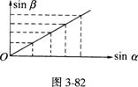 在多次改变入射角、测量相对应的入射角和折射角正弦值基础上,以sina值为横坐标、以sinβ值为纵坐标,建立直角坐标系。如图3-82所示。描数据点,过数据点连线得一条过原点的直线。